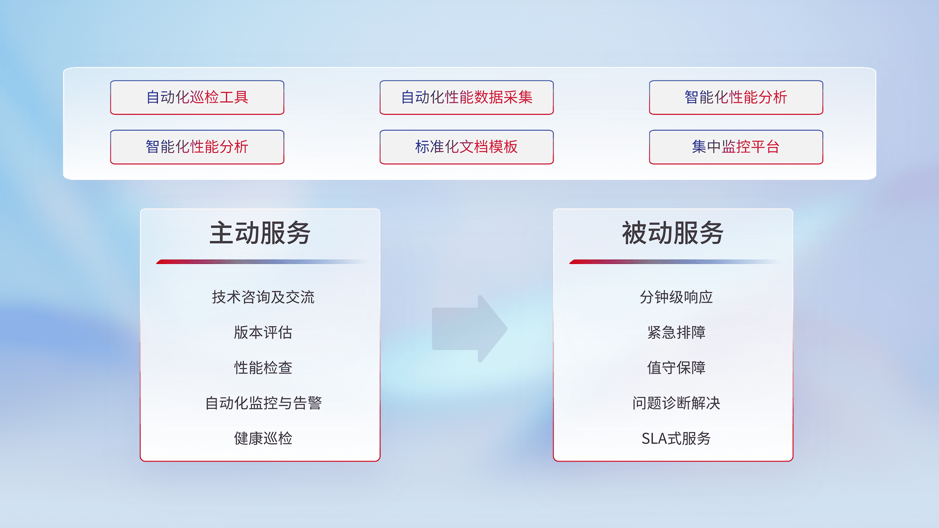 智能化工具和标准化文档,,,保障服务质量,,,提供主动服务(包含技术咨询、、、版本评估、、性能检查、、、、自动化监控与告警、、、健康巡检)和被动服务包含(分钟级响应、、紧急排障、、值守保障、、、问题诊断解决、、、、SLA服务)。。。。