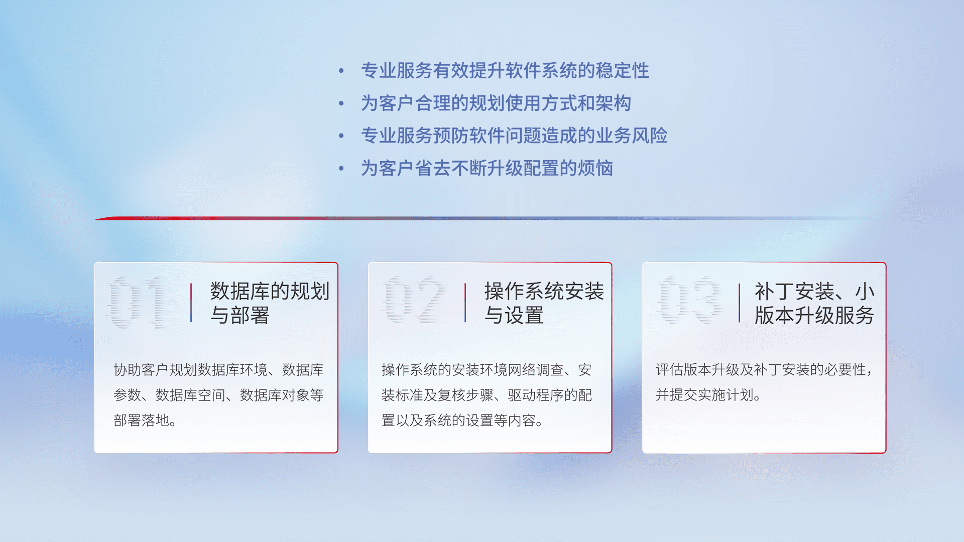 为客户提供软件规模升级、、快速部署、、按需配置的专业服务,,,,从数据库的规划与部署到操作系统的安装与设置,,再到补丁安装和小版本升级提供支持。。。